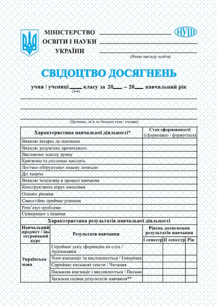Свідоцтво досягнень для ученика (учнівський табель) – це невід’ємна частина будь-якої школи та класу. Дане свідоцтво створене для спілкування вчителя із батьками учнів п’ятого та шостого класу. Це допоможе батькам краще розуміти навчальні та класні досягнення учнів п’ятого та шостого класу. Посібник рекомендацій для учителів, класних керівників шкіл. Свідоцтво досягнень для ученика надрукувань відповідно до вимог Міністерства освіти і науки України та програми Нова українська школа (НУШ).